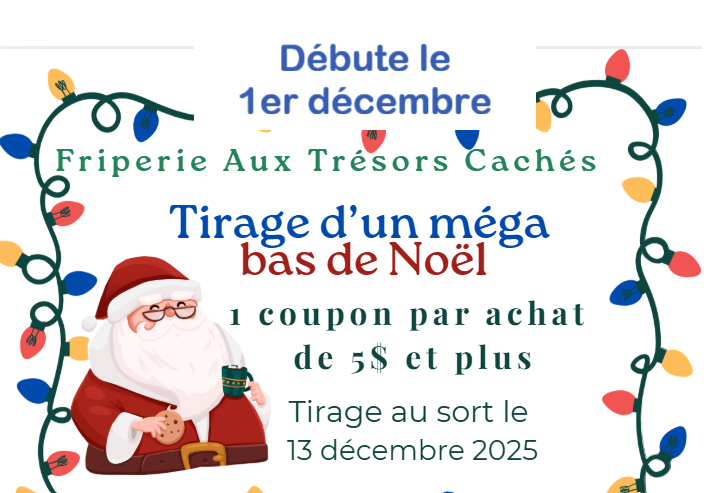 À partir du 1er décembre, chaque client qui achète pour plus de 5$ se verra remettre un coupon à remplir pour participer au tirage d'un méga bas de Noël. Le tirage au sort se fera le 13 décembre 2025.